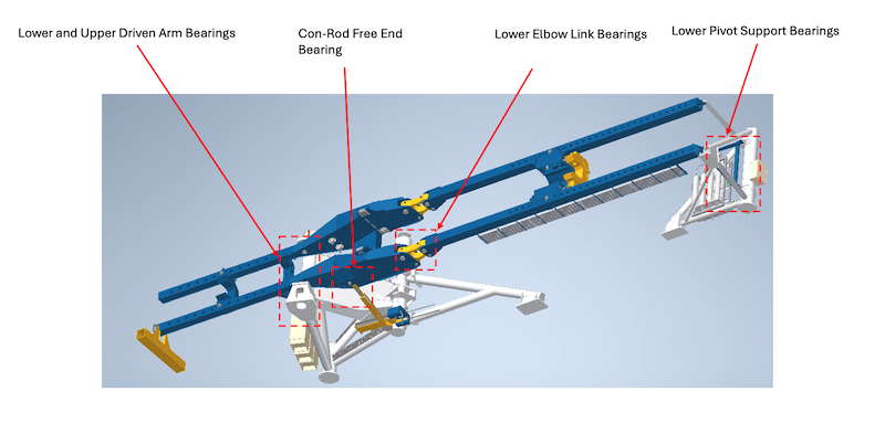 With regards to the bearings, the lower and upper pivot driven arms and elbow links featured spherical roller bearings that were showing signs of wear during the testing phase, prior to full-scale production of the rig. Unidirectional axial load was seen in most of the bearings and the rig’s use meant that these arms and elbow links would spend most of their lifetime at smaller oscillation amplitudes. On the removal and disassembly of the bearings to assess the problem further it became clear that false brinelling wear was being caused as a result of both radial and axial load and the bearings having only small angles of oscillation.