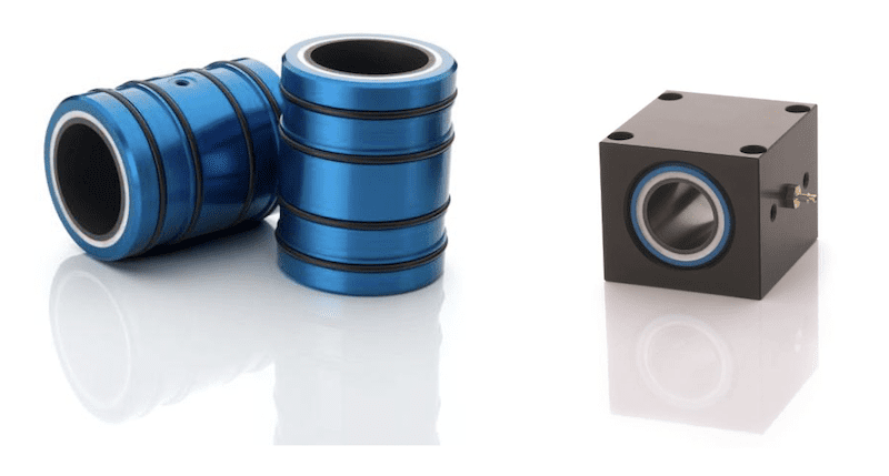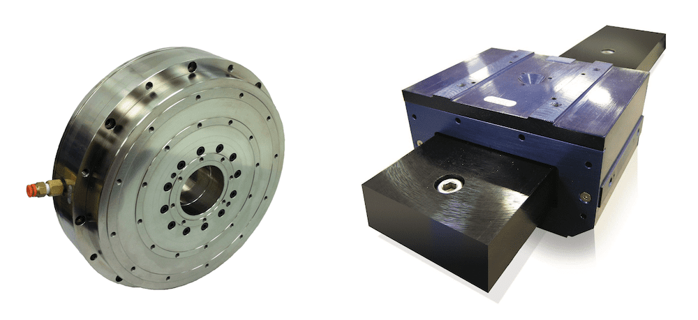 There are linear guide air bearings and rotary table air bearings. They have the same functionality of their rolling element kin, but significantly better smoothness, precision and especially low friction. You can buy them with motors and encoders already integrated or buy just the air bearing and do the integration yourself. The Air Way linear guides pictured are especially convenient for engineers as they are purchased and bolted down just like conventional rolling element linear guides.