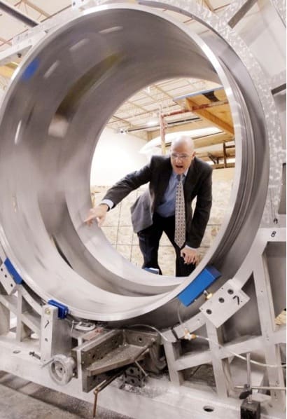 elements they contain need to be fit with a high degree of precision. This has been the exclusive domain of bearing manufacturers. Because radial air bearings support the rotor from a small percentage of the circumference, the relative size between the rotor and the radius on the bearing is not very critical. This means you can buy the radial air bearings and machine bearing surfaces on the rotor yourself. The bearings mount on spherical ball gimbal seats so they are self-aligning to the rotor. Because the gimbals are on threaded studs, they are adjustable, so no precision is required on the stator to mount the bearings, just a threaded hole for the studs. This is in contrast to the 360-degree flat mounting surface with many taped holes required by a large roller bearing or slewing ring.