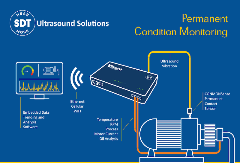 The Vigilant is a remote condition monitoring solution that integrates ultrasound and vibration analytics to keep critical assets running smoothly. Designed with flexibility and precision, the Vigilant enables proactive maintenance strategies for a wide range of industrial applications.