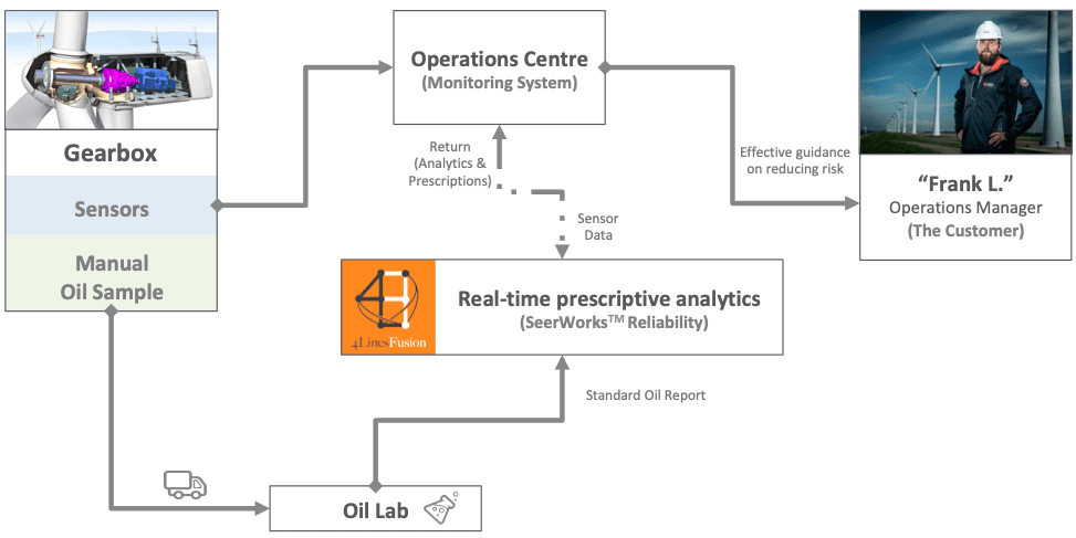 Industrial Analytics is the process of collecting, analyzing, and using data generated from industrial operations with the aim of both increasing cost savings and enhancing the reliability of rotating equipment. 4LinesFusion, Inc. has developed an Industrial Analytics Software-as-a-Service (SaaS) solution called SeerWorksTM Reliability, which increases bearing reliability by accurately and proactively predicting failure before it happens and taking appropriate action (Reliability-as-a-Service). By digitally assessing the health of both the machine elements and their lubricants, SeerWorksTM Reliability makes it possible to identify risks during smooth operation – before damage occurs – by looking into the future, and deliver precision machine reliability. The technology has been successfully applied in the wind, marine and automotive industries. It reduces downtime and costs, extends service life, improves oil quality control, and promotes evidence-based maintenance for OEMs and aftermarkets.