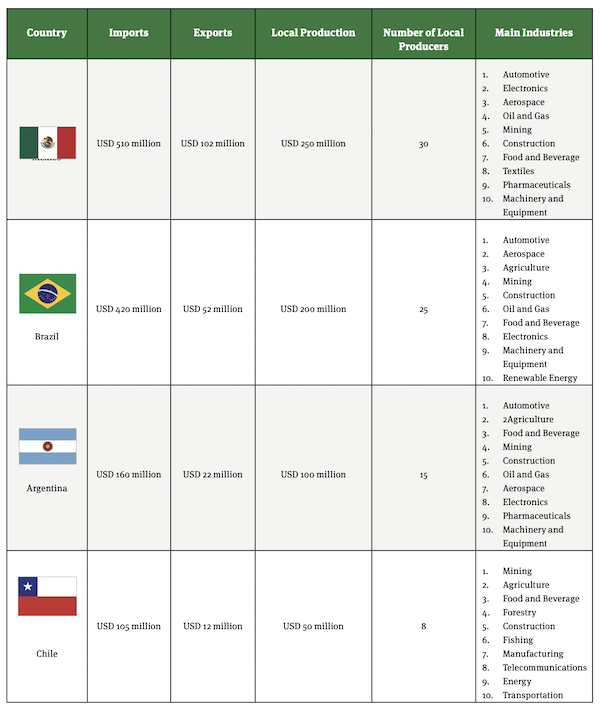 The ball and roller bearing market in Latin-America is poised for sustained growth, driven by industrial expansion, technological advancements, and increasing investments. Key players in the market are focusing on innovation and strategic partnerships to meet the evolving demands of the region. As the market dynamics continue to evolve, opportunities for growth and development in this sector remain robust. The market in Latin America exhibits significant import volumes to meet the industrial and automotive sectors’ needs. Brazil and Mexico lead in both imports and local production, reflecting their robust industrial infrastructure. Argentina, Chile, and Colombia also have notable local production capabilities, though on a smaller scale. Local production helps mitigate import dependency, but exports remain relatively low across the region, highlighting potential areas for growth in production and international trade.