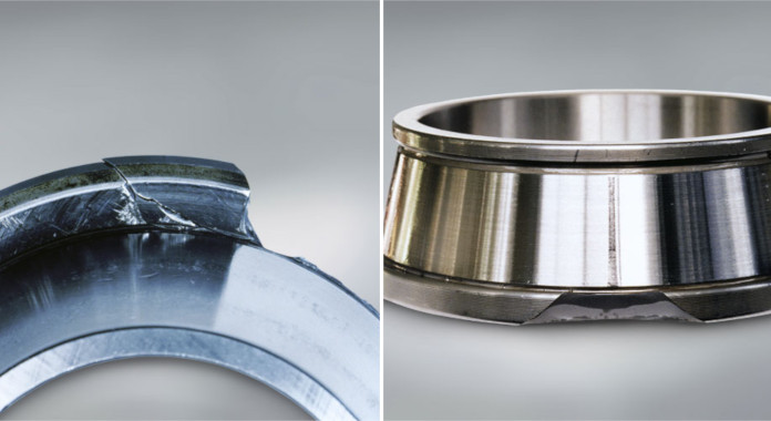 Fracture refers to small pieces which were broken off due to excessive load or shock load acting locally on a roller corner or rib of a raceway ring.