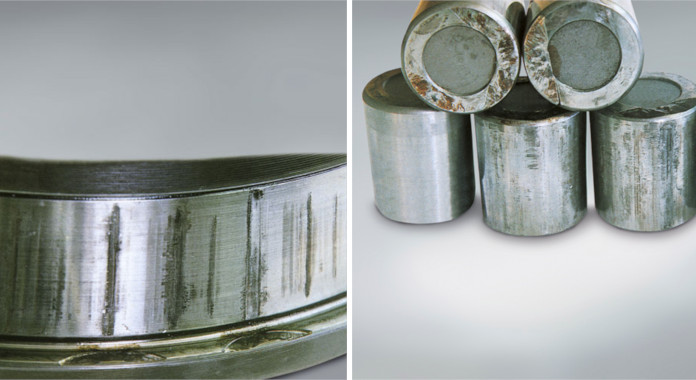 Wear is surface deterioration due to sliding friction at the surface of the raceway, rolling elements, roller end faces, rib face, cage pockets, etc.