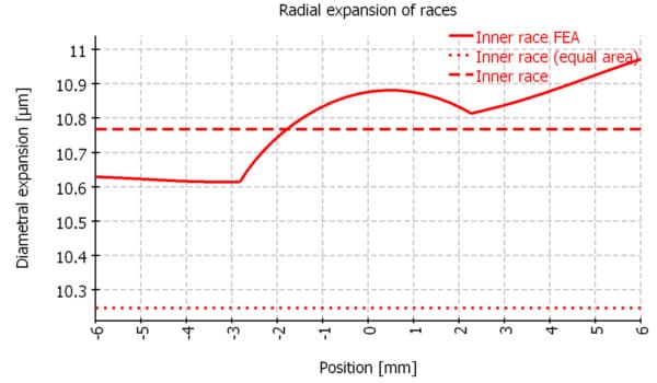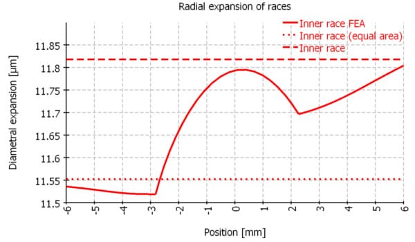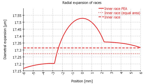 To get an estimate about the influence of the shoulders of the bearing rings on the change of effective clearance an axisymmetric FEA calculation was added to the MESYS bearing calculation software. The diametral expansion on the outer contour of the ring is shown in a diagram in comparison to the calculation of cylindrical rings according to thick ring theory. Two options are considered for thick ring theory. Either the pitch diameter plus/minus ball diameter Dpw±Dw is used for the second diameter of the ring or a diameter leading to the same cross section area as the real cross section including shoulders.