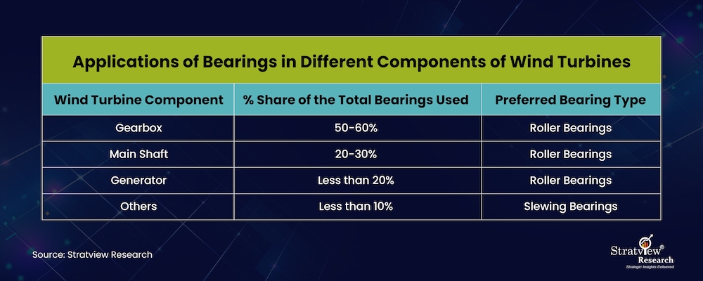 Bearings are mechanical components used to reduce friction between the moving parts by allowing two surfaces to roll over each other instead of sliding. In a wind turbine, bearings facilitate the smooth rotation of blades, yaw systems, and gearboxes. Gearboxes, which translate the low-speed main shaft to the high-speed generator shaft, are the most commonly used application for bearings constituting around 56% of the total wind energy bearings market. The main shaft that connects the turbine blades to the gearbox is another significant application, followed by electrical generators that convert mechanical energy into electricity. Other applications, such as Yaw and Pitch, constitute a small portion of the market.
