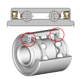 Conventional sealed bearings for agricultural machine attachments have two radial lips for improved mud resistance, but our new product has an additional axial lip in addition to the radial lip to optimize the geometry, reduce torque and achieve high sealing performance. The picture on the right shows the new 3-lips version with shape optimization and a shield labyrinth, resulting in more than doubling of the mud resistance.