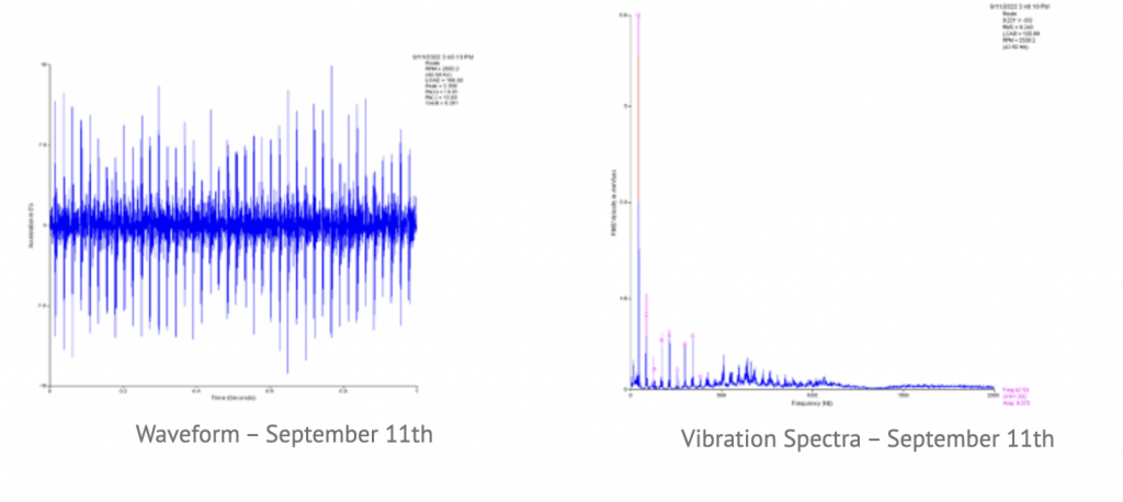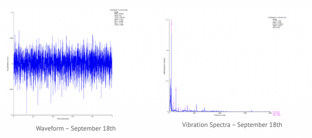 As seen in the vibration data, the bearings were in a failed state due to mechanical looseness and required replacement. They were replaced during the next shutdown, and new vibration measurements were taken on the machine. As seen below, the overall RMS went from 8.2 to 2.7 after the bearings were replaced.