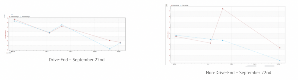 Since switching to the ultrasonic condition-based method for greasing their bearings based, Torki and his fellow lubrication technicians noticed a steep decline in grease consumed. It used to be 50 grams every two weeks for both the drive-end & non-drive-end bearings, it dropped to 16 grams for the drive-end and 14.4 grams for the non-drive-end during the most recent successful lubrication task, which can be seen in the following two figures.