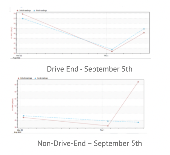 Since switching to the ultrasonic condition-based method for greasing their bearings based, Torki and his fellow lubrication technicians noticed a steep decline in grease consumed. It used to be 50 grams every two weeks for both the drive-end & non-drive-end bearings, it dropped to 16 grams for the drive-end and 14.4 grams for the non-drive-end during the most recent successful lubrication task, which can be seen in the following two figures.