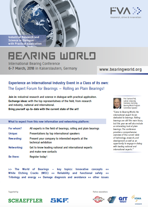 Bearing World is the international expert forum for bearings. The platform allows researchers, developers from universities and bearing manufacturers come together in dialogue with users and experts from the industry. The goal is to align the drive technology industry more closely to the requirements of the future.