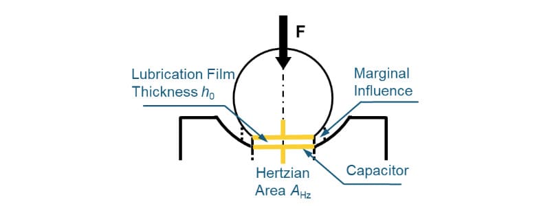 The current trend in process monitoring and predictive maintenance propels the development of sensor-rich systems. Against this background, the authors investigate using bearings’ electric properties as a sensor. This approach is based on electric impedance of bearings under an EHD regime, which depends on bearing load, speed and temperature. In an EHD regime, a non-conductive lubricant separates the surfaces of the rolling elements and the bearing rings. The electric model for every rolling contact is a plate capacitor, with the plates formed by the Hertzian area and the lubrication film thickness being the plate distance, as shown in Figure 1. In addition, the marginal area around the Hertzian area influences the electric impedance. Figure 2 shows a schematic design of such a sensor bearing. The lubrication film thickness depends on the temperature and rotational speed of the bearing [1]. Therefore, speed and temperature sensors are integrated into the sensory bearing. The electric measurement circuit needs to be isolated from the metal structure of the machine; the necessary isolating layers are shown by red lines in Figure 2. Finally, the electric impedance, temperature and rotation speed data are processed into information about bearing loads, lubrication condition and possibly bearing condition.