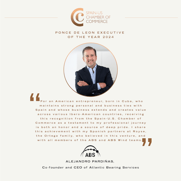 Reflecting on the award, Pardiñas commented: “For an American entrepreneur, born in Cuba, who maintains strong personal and business ties with Spain and whose business extends and creates value across various Ibero-American countries, receiving this recognition from the Spain-U.S. Chamber of Commerce as a testament to my professional journey is both an honor and a source of deep pride. I share this achievement with my Spanish partners at Royse, the Ortega family, who believed in this venture, and with all members of the ABS and ABS Wind teams.”
