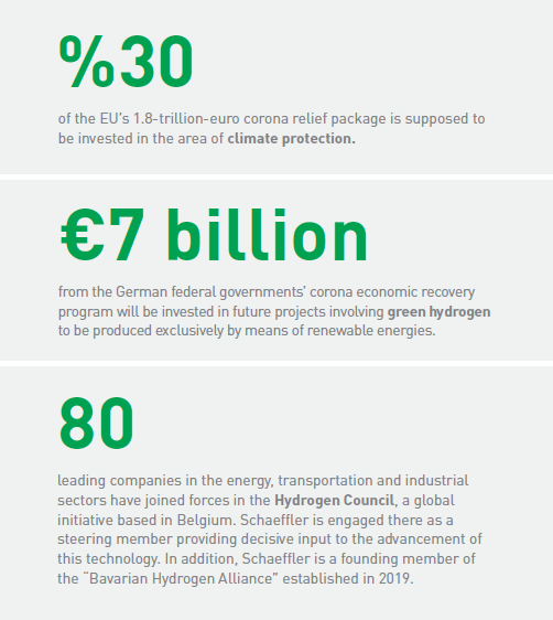 The significance of focusing on the right technologies has sharply increased. Here, we’re benefiting from our innovation program that we’ve consistently continued to implement also during corona. It enables us to compare innovative ideas with Schaeffler’s market potential and fields of expertise and select the technologies we’re going to pursue in greater depth accordingly. However, corona has not led to any fundamental changes regarding basic technological trends. Now being massively boosted, hydrogen and electric mobility are technological trends that we’ve been focused on for a long time: In the context of a carbon- neutral, sustainable future, our emphasis is placed on the enormous potential of green hydrogen. As an automotive and industrial supplier, we keep our eye on the entire range of applications – from hydrogen production using electrolysis to mobile and stationary applications in fuel cells to the utilization of hydrogen-based direct-reduction steels. We’re actively engaged in a large number of hydrogen initiatives in order to establish and help shape the hydrogen eco-system together with strong partners. As a supplier of systems and key components, we’re going to play an important part in this context. Plus, we’re also in a very good position in other areas such as electric mobility (see page 62) and robotics (see page 78), and have frequently demonstrated the expertise we’ve massively expanded in the area of systems in recent years.