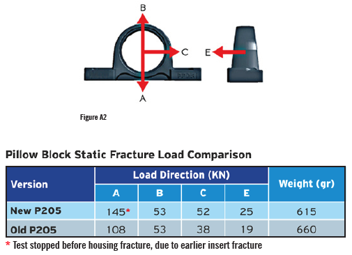 One of the challenges for the Koyo engineers was to increase the stiffness of the housing itself and to assure a more firm mounting of the housing on the supporting frame. After extensive FEM (Finite Elements Method) analyses and a thorough assessment of the stress concentrations in the old design a more robust design could be developed which increased the strength by up to 30% (depending on the direction of the applied forces – see Figure A1 ), while reducing the weight by around 7% at the same time.