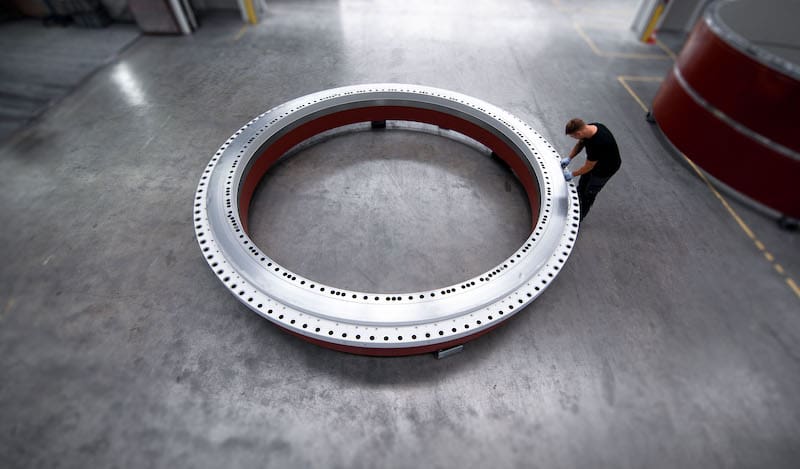 The floating structure is as reliable as its land-based counterpart: To ensure the self-alignment of these turbines, the Liebherr slewing bearings function as a mooring-system. For this purpose, a bearing with a diameter of four metres is installed as a connecting element between the anchor buoy and the float below the sea surface. Because the slewing bearing has to withstand high pressure and corrosive environmental conditions, some components are made of stainless steel or welded on with stainless steel. In addition, the bearing has two sensors that can detect the unlikely event of water ingress – for example, when seals wear out – at two measuring points. One is located in the first lower chamber – the second in the second upper chamber of the floating turbine. In this way, Liebherr’s unique smart bearing lubrication monitoring comes into play and shows, whether it is necessary to intervene. In case of maintenance or repair, the float with the turbines can be separated from the anchor buoy and towed to a harbour. Thus, by providing such a mooring system, Liebherr does not only contribute to the efficient use of wind as a resource on the high seas, but also to easy maintenance of floating wind turbines.