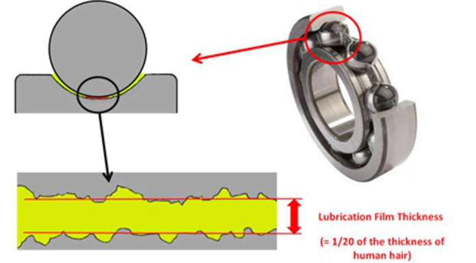 In a bearing with a good average lubrication film thickness, the metal surfaces are separated and the average thickness of this separation or film is very small, in fact it is about one twentieth of the thickness of a strand of human hair. See figure 1