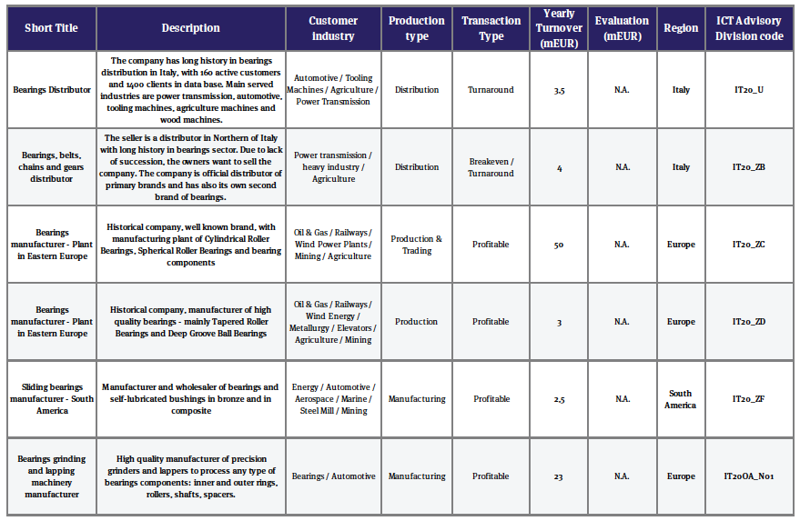 ICT Advisory Division aims to become the reference advisor for all company sales, partnerships and acquisitions operations in the bearings industry in Europe, Asia and America.