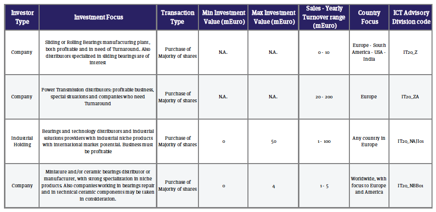 In similar way, investors ask ICT to assist in their acquisition projects. ICT Advisory Division shares on the following table the list of some of the open acquisition searches.