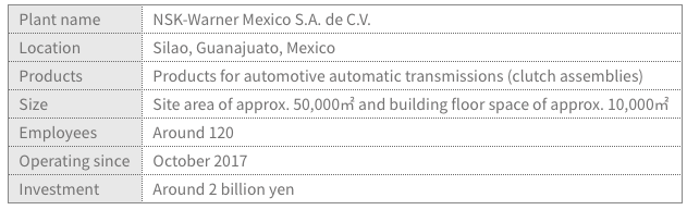 NSK Ltd. (NSK; Headquarters: Tokyo, Japan; President and CEO: Toshihiro Uchiyama) today announced that NSK-Warner K.K. (NWC; Headquarters: Fukuroi, Shizuoka Prefecture, Japan; President and CEO: Sakae Kuwashiro), an equity method affiliate, has inaugurated its new plant in Mexico.