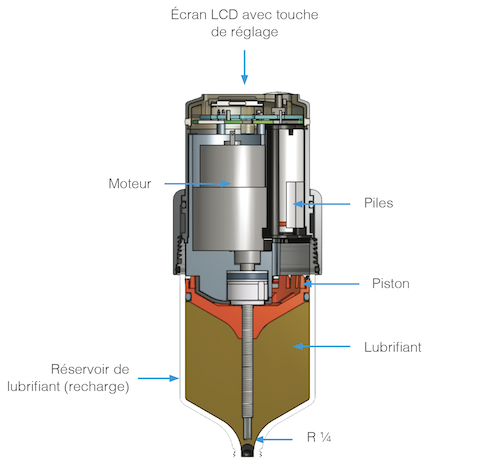 The DRIVE BOOSTER is fitted with a geared motor (powered by three batteries supplied with the first order and with each refill) that pushes a piston to extract the grease at a pressure of up to 7.5 bar. This allows the grease gun to be mounted remotely, up to 5 metres from the point to be lubricated. Its LCD display, equipped with an adjustment button, indicates the dispensing time, the size of the cartridge and the operating status of the grease gun.