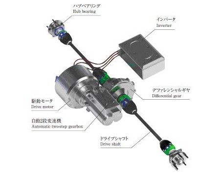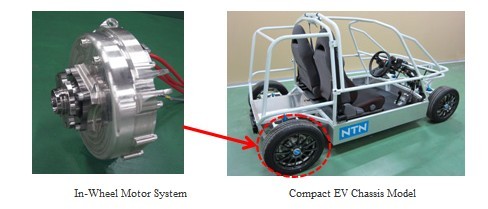 In-Wheel Motor System(see here for details) and Compact EV Chassis Model A compact in-wheel motor that utilizes a thin hub bearing, reducer and motor, which can be mounted within small diameter wheels of commuters. The system also includes a drive motor, reducer, hub bearing and inverter for advanced vehicle control.