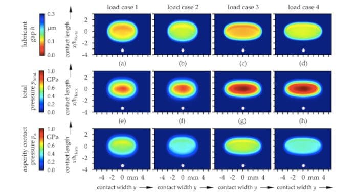 Due to the roller radius in and the logarithmic profile perpendicular to the direction of motion, the initial conditions featured typical characteristics for elliptical EHL contacts with a horseshoe-shaped lubricant gap (Figure 5a–d), a total pressure distribution similar to Hertz (Figure 5e–h) as well as a constriction in the film height as well as a barely pronounced Petrusevich spike in the outlet region. Due to the smaller contact area, the pressures exceeded the Hertzian values determined for a perfect line contact (Table 1). In addition, the speed profile (Figure 1b) resulted in a slight asymmetry and tilting of the contact area. The clearly recognizable asperity contact pressure (Figure 5i–l) followed the lubricant height in shape and indicated an operation under mixed EHL conditions. The effects of the load case and oil on the lubricant gap and the pressure formation basically corresponded to theoretical expectations.Higher speed (load case 2) and higher viscosity (Figure 6) led to a larger and higher load (load case 3, 4) to a lower fluid film height. Accordingly, the asperity contact pressure behaved just oppositely. Moreover, the higher load led to a significantly larger elastically deformed contact area. It should be noted that although the contact width y was scaled in the same way for all cases, the contact length x was plotted normalized to the Hertzian width for reasons of reduced space requirements. Thus, the contact area actually expanded further in the x direction at higher loads as well.