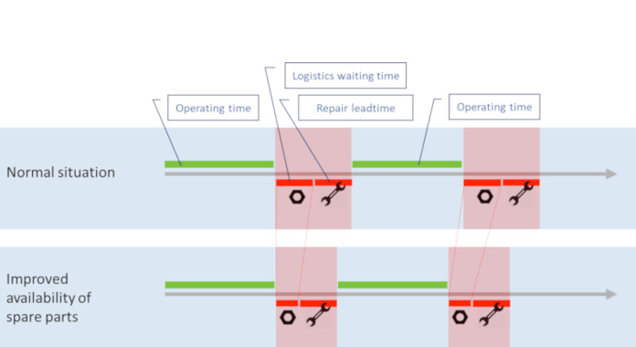In the normal situation in the picture below, half of the ‘Down’ time (28% per year) consists of waiting for materials (14%) and the other half of actual maintenance (14%).
