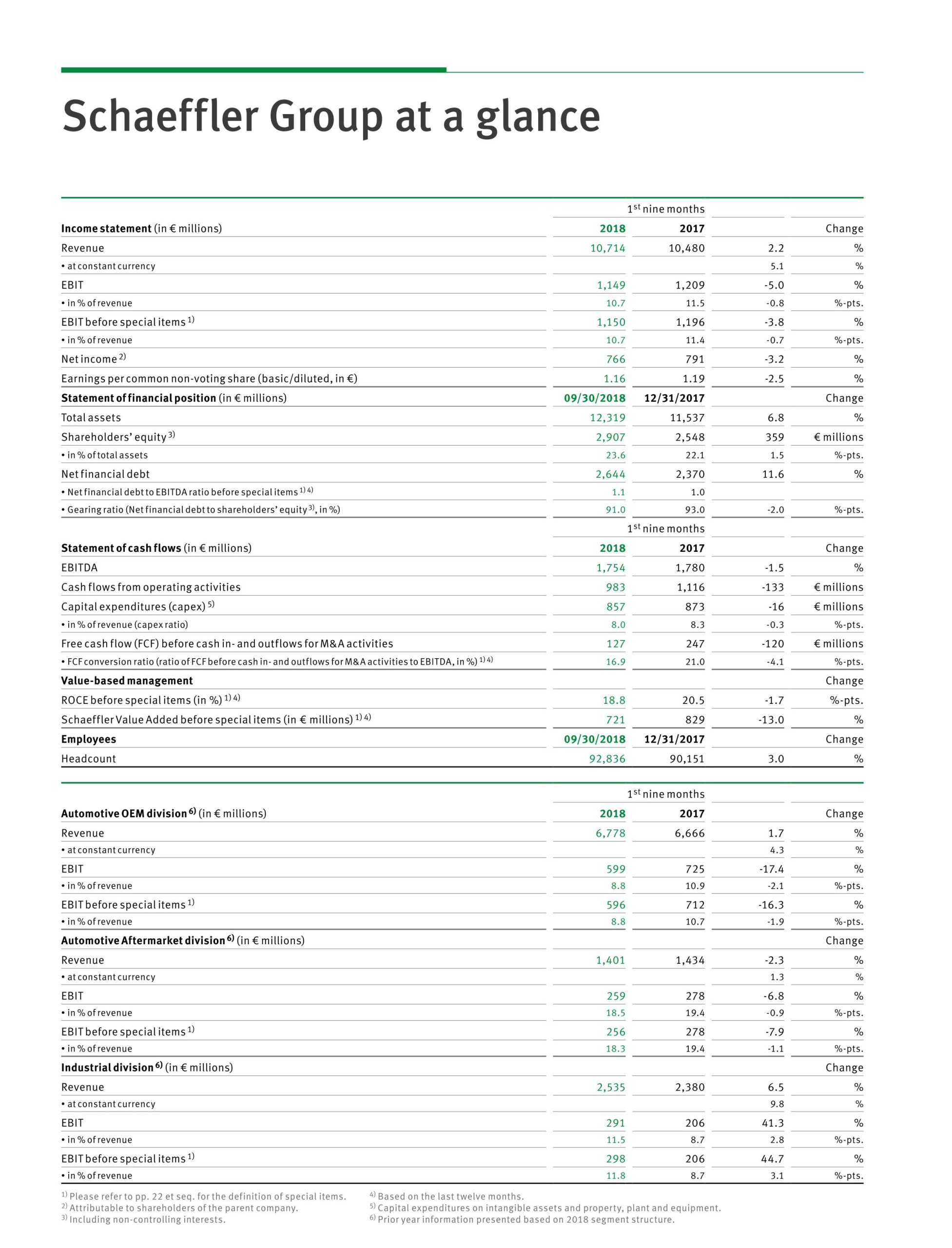 Based on the adjusted full-year guidance issued October 30, 2018, the Schaeffler Group now anticipates revenue growth of 4 to 5 percent (previously 5 to 6 percent) at constant currency, an EBIT margin before special items of 9.5 to 10.5 percent (previously 10.5 to 11.5 percent), and free cash flow before cash in- and outflows for M&A activities of approximately 300 million euros (previously approximately 450 million euros).
