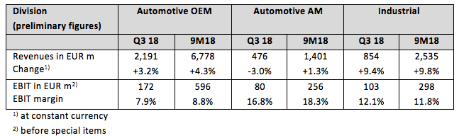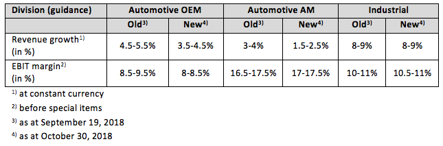 On the basis of preliminary figures, Schaeffler is now guiding for 2018 full-year revenue growth of 4 to 5 per cent at constant currency (previously 5 to 6 per cent), an EBIT margin before special items of 9.5 to 10.5 per cent (previously 10.5 to 11.5 per cent), and free cash flow before inflows and outflows for M&A activities of approximately EUR 300 million (previously approximately EUR 450 million). The guidance for each of the divisions now is as follows: