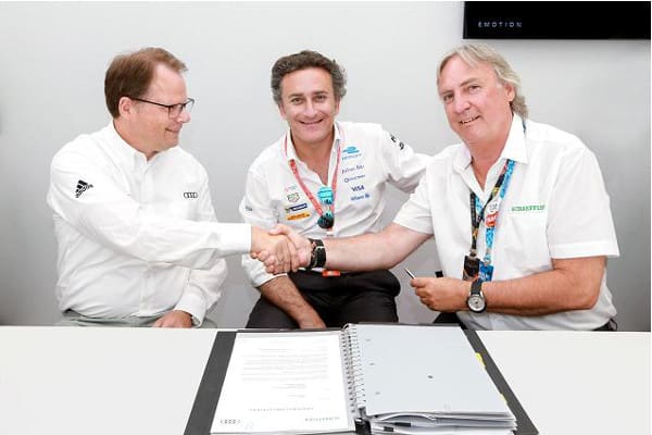 During the German home round of Team ABT Schaeffler Audi Sport in Berlin (June 10/11) Schaeffler and Audi agreed on an extensive cooperation in the development of the powertrain for the next three generations of the Formula E racing car. Schaeffler Chief Technology Officer Prof. Peter Gutzmer and Peter Mertens, Member of the Board of Management, Technical Development AUDI AG, signed a three-year agreement in Berlin-Tempelhof.