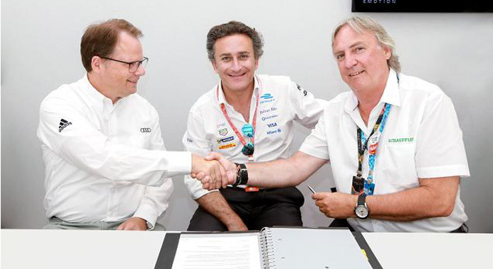 Signing of the agreement during the Berlin ePrix. From left to right: Dr. Peter Mertens (Member of the Board of Management, Technical Development, AUDI AG), Alejandro Agag (CEO FIA Formula E) and Prof. Dr. Peter Gutzmer (Deputy CEO and Chief Technology Officer Schaeffler).