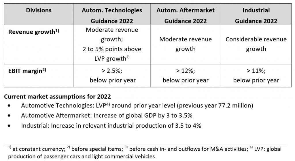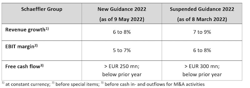 The new guidance is based on the assumption that the growth of the global economy as a whole will slow down noticeably and that this will have an impact on Schaeffler Group’s sales and procurement markets. The economic sanctions imposed against the backdrop of the war in Ukraine, the impact on supply chains, raw material and energy prices, as well as transportation costs have been taken into account to the existing extent until year end. Influences of the coronavirus pandemic, which has not yet been overcome, on the Group’s value chain have been taken into account at the current level. With regard to China, economic activity is assumed to normalize by the end of June 2022.