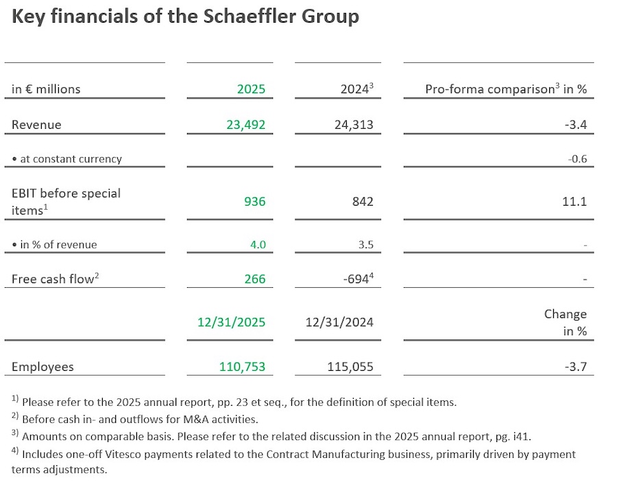The Schaeffler Group published its results for 2025 today. Revenue for the reporting period was down slightly, decreasing by 0.6 percent to 23,492 million euros (pro-forma prior year: 24,313 million euros), compared on a pro-forma basis and at constant currency.