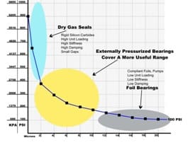 Foil bearings are fluid film bearings supported on flexible bumps or leaves so there is low load and stiffness but large gaps and high speed capability. In contrast the bearing technology in dry gas seals often uses stiff silicon carbide and high unit loading with small gaps. All of these cases are examples of dynamic bearings; that is, fluid film bearings that generate pressure to support the load from the relative motion between the bearing surfaces. This is what our turbo industries are used to.