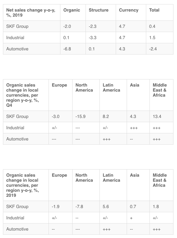 “2019 has been a solid year for SKF. We saw stable demand during the first half of the year. During the last six months, we maintained a strong operating result, despite falling demand. A consistent focus on cost reduction, especially during the fourth quarter, where cost reductions more than compensated for cost inflation, has allowed us to continue to deliver solid results, whilst continuing to invest in our factories and in R&D.