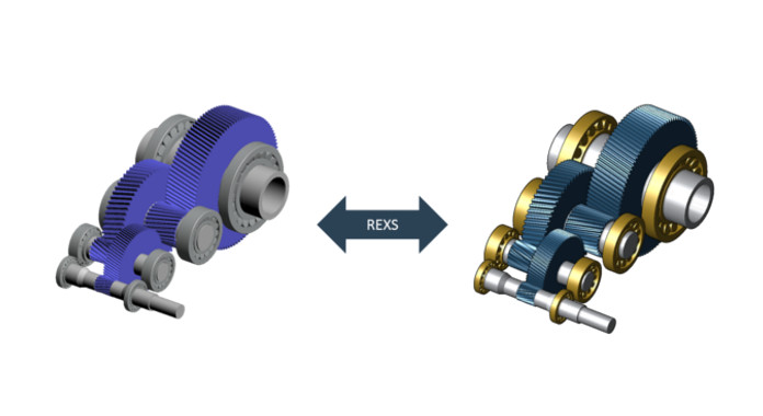 In REXS, the components of a gearbox are defined based on common parameters. The REXS specification includes everything necessary to define a gearbox model. Essentially, this includes the machine elements, their attributes, and the relations which are used to define the relationships between machine elements. The simple and generic structure of REXS makes it possible to depict individual components, assemblies, and complex gearbox structures.