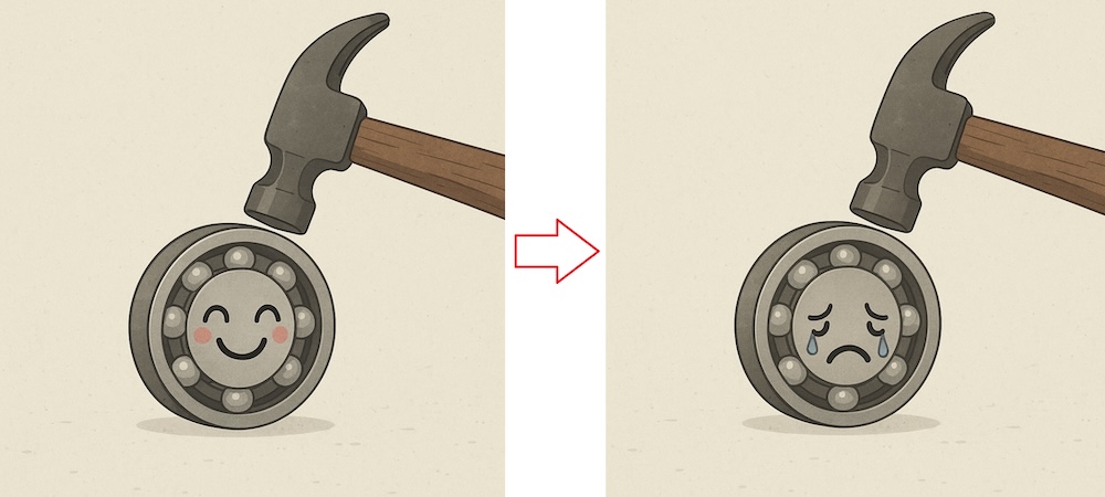 Hammering a rolling bearing during mounting, especially with point contact, causes damage due to the delicate internal design and extremely high contact stresses involved. Let’s break it down technically and visually: