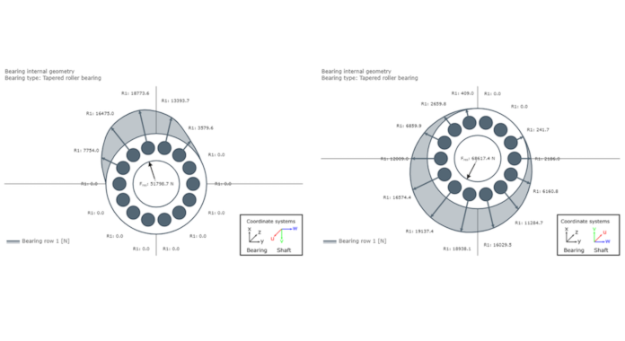 It can be seen that the deflection of both cylindrical roller bearings of the output shaft is nearly identical (Figure 2, right). In contrast, there is significant misalignment on the drive shaft. This is largely due to the so-called centering effect on the right tapered roller bearing. In the left bearing, only the rolling elements in the direction of the radial force are loaded (Figure 3, left), causing the bearing to deflect in this direction. In the right bearing, the restoring force on the shaft resulting from the radial force and the contact angle is lower than the applied axial force from the gearing. As a result, the shaft is pushed into the bearing so that the rolling bodies are in contact across the entire circumference (Figure 3, right). Thus, the shaft deflects only slightly in the direction of the radial force.