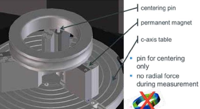 The rotary table, by itself has a radial run out of 0.2 μm only. Together with the Klingelnberg de-signed measuring head 3DNANOSCAN the capability to perform form tests is therefore fully guaranteed. An automatic three-jaw chuck offers controlled and low clamping forces. For very thin rings it can be equipped with magnets on the jaws to fix the part as shown in Figure 2. This allows high precision form testing with absolutely no influence of the clamping on the measuring results.
