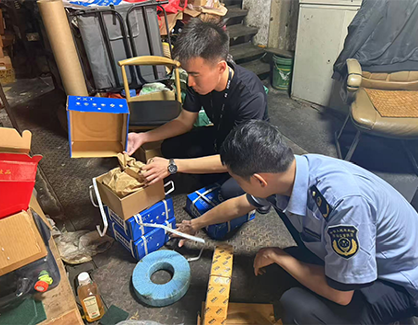 After a joint review of the case with the Nankai Public Security Bureau, officials launched a coordinated enforcement action. Inspections of warehouses and storefronts revealed products bearing the “HRB” label. According to expert verification conducted by the trademark owner, all seized items were confirmed to be counterfeit and in violation of exclusive trademark rights.
