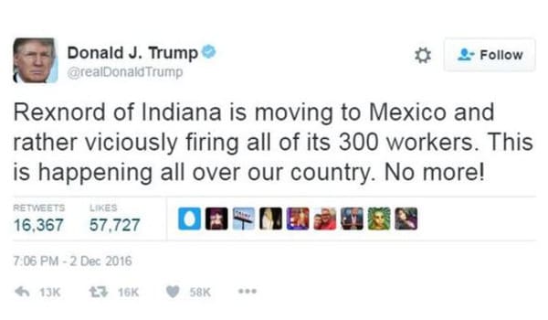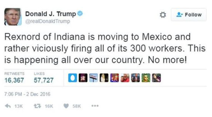“Rexnord of Indiana is moving to Mexico and rather viciously firing all of its 300 workers,” Trump wrote on his Twitter feed Friday night. “This is happening all over our country. No more!”
