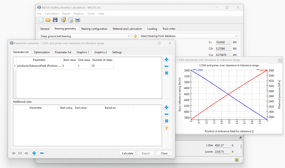 The calculation module for axial-radial-roller-bearings now also includes a parameter variation like the other calculation modules. This allows to vary geometry data and for example the stiffness can be shown over bearing clearance.