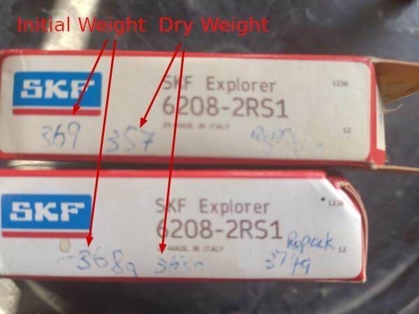 It appears in both these occasions the Initial Total weights are within a gram (Resolution of the scale) suggesting the grease fill is controlled to a total weight, irrespective of the Dry bearing weight.