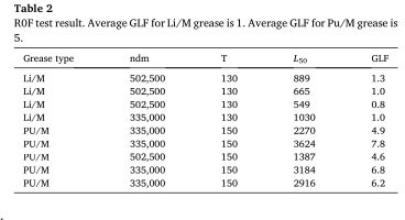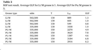 Li/M is the Lithium based Thickener, and in comparison the PU/M is the Poly-urea based thickener showing a GLF (Grease Service Factor) significantly higher with an average well above x5.
