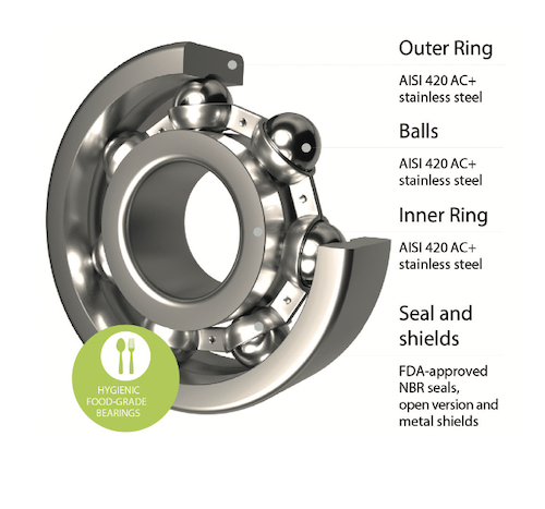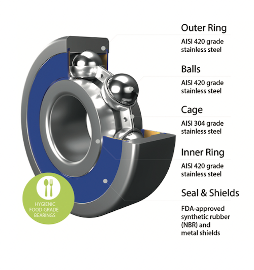 - Equipped with FDA-approved NBR seals and metal shields for lubricant retention and corrosion prevention.