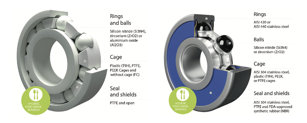 - Ideal for food applications requiring superior corrosion resistance and higher temperature capabilities than stainless steel bearings.